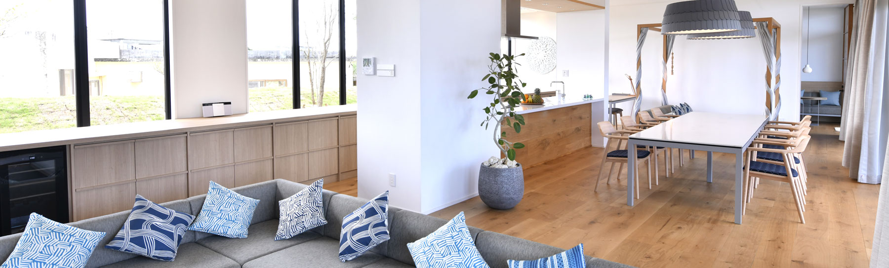 アイランド型のキッチンと一体となった広々ダイニング。佐和田の浜の風景をスパイスにお食事を楽しめます。